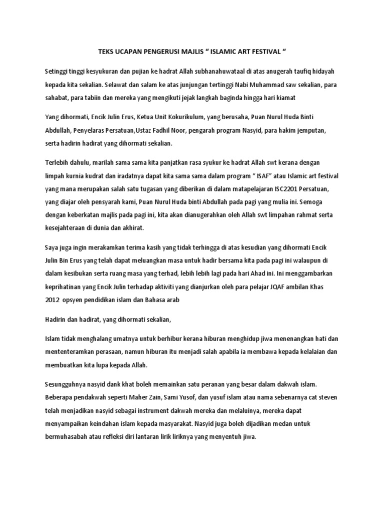 VIDEO Forum Perdana Majlis Penutupan Festival Kesenian Islam 2019 iFest2019 List of Videos Forum Perdana Majlis Penutupan Festival Kesenian Islam 2019 iFest2019. Contoh Teks Pembawa Acara Pembawa acara memiliki tugas sebagai pemandu agar acara bisa sesuai dengan susunan yang telah dibuat sebelumnya. Datuk Bandar MBSP 2020 5 Dalam meneruskan momentum festival-festival seni terkenal di Pulau Pinang Penang International Container Art Festival PICAF adalah tarikan terbaru di Pulau Pinang ang dikatakan adalah y g yanpertama di Asia yang mengetengahkan senilukis urban yang dilukis di atas kontena-kontena.